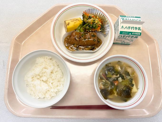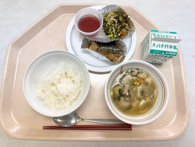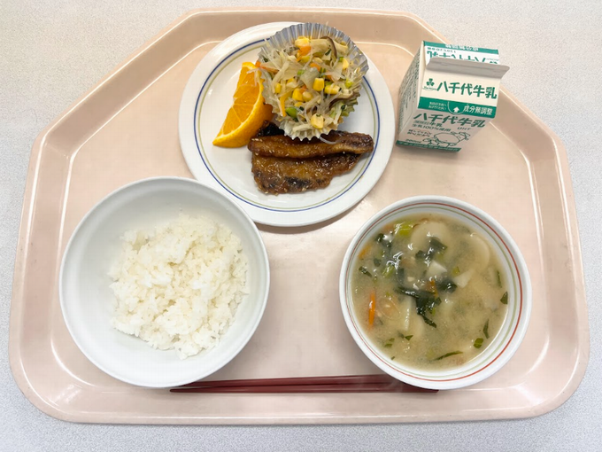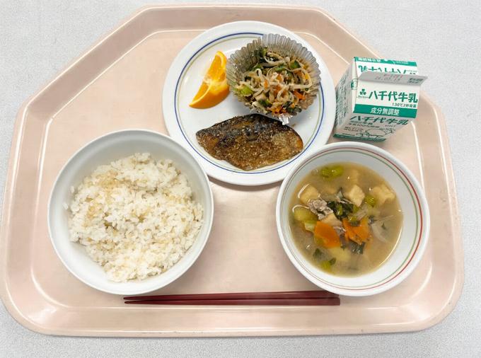 【A献立】船橋産米のご飯 コノシロのさんが焼き ビーフンソテー さつま汁 いよかん