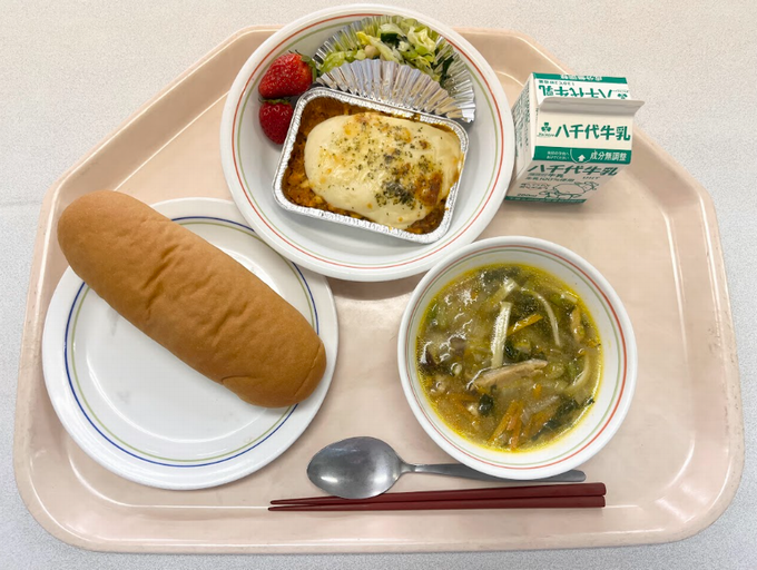 【B献立】ブランコッペパン 豆腐のミートグラタン 大豆サラダ カレーヌードルスープ いちご