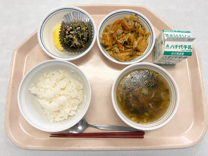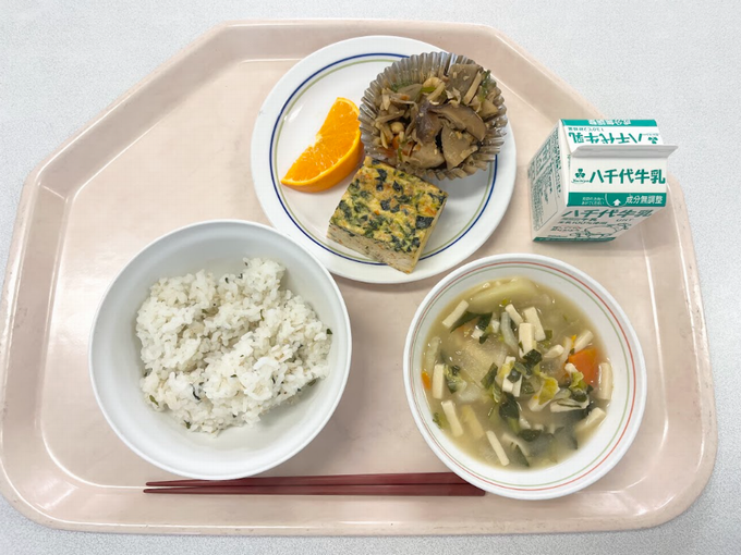 【A献立】わかめご飯 ツナとひじきの卵焼き 磯香和え 根菜ごま汁 オレンジ