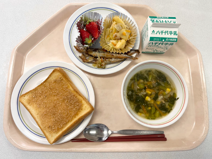 【B献立】シナモンセサミトースト ししゃものラビゴットソース ジャーマンポテト ジュリアンスープ いちご