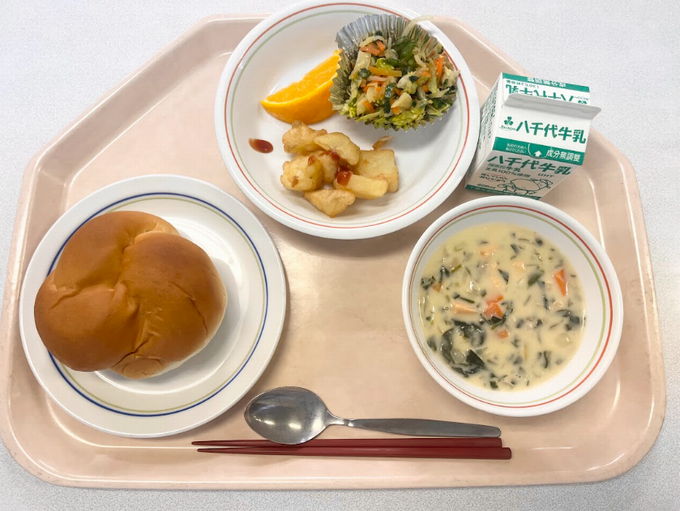 【B献立】ハチミツパン 鮭とほうれんそうのクリームシチュー コロコロポテトフライ ごまドレッシングサラダ デコポン