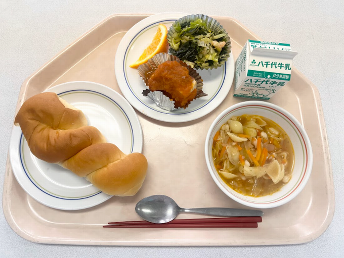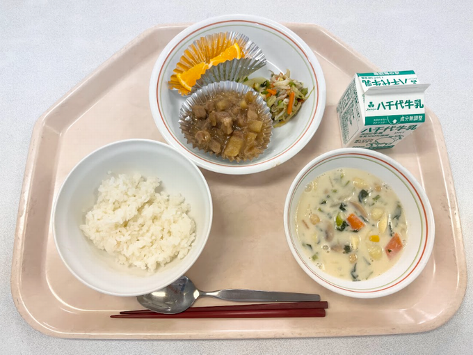 【B献立】コッペパン イチゴジャム くじら肉のノルウェー風 コーンサラダ 豆のクリームポタージュ オレンジ