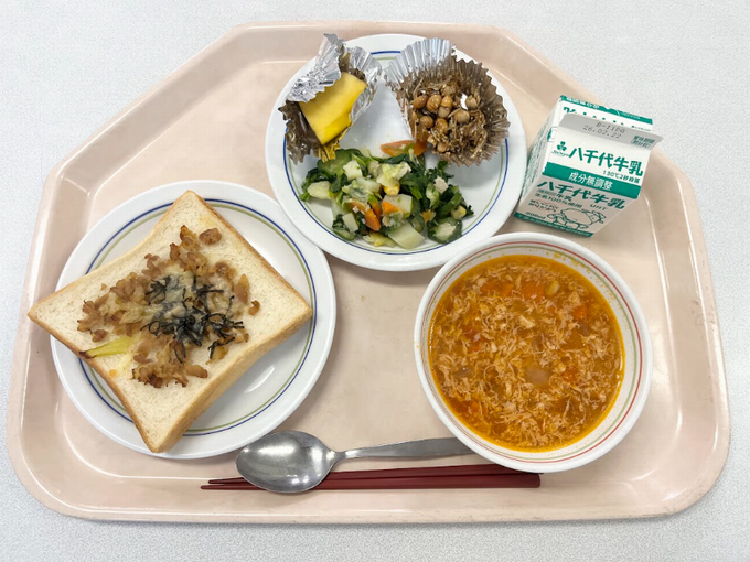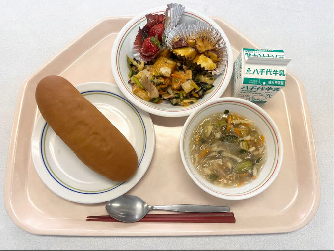 【B献立】コッペパン いちごジャム チーズオムレツ 生揚げのチョレギサラダ 野菜とチキンのスープ バナナ
