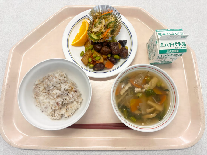 【A献立】コーンペッパーライス アリゾナステーキ ごぼうと大豆のり風味揚げ 小松菜の五目ソテー レンズ豆のスープ みかん