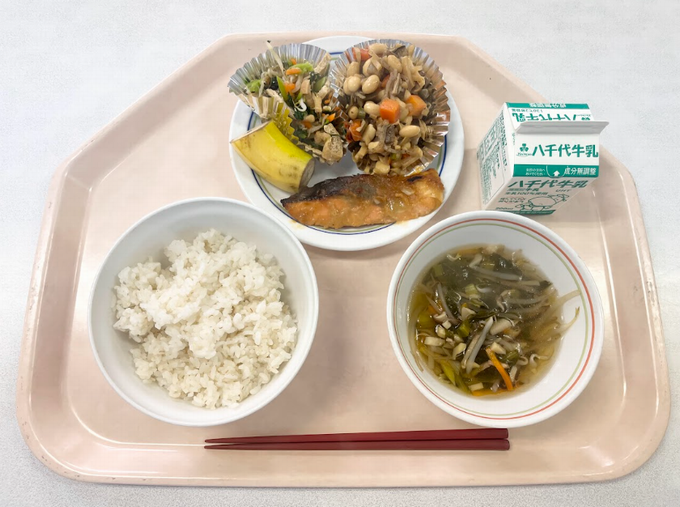【A献立】麦ご飯 鮭のにんにくみそ焼き おひたし 五目煮豆 沢煮わん バナナ