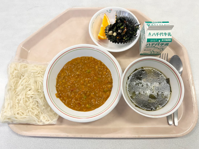 【B献立】ソフト麺ミートソース ひじきとチーズのサラダ 小松菜とわかめのスープ オレンジ