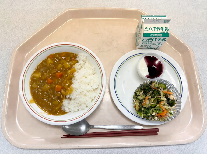 【A献立】ポークカレーライス 海藻とツナのサラダ ヨーグルトのブルーベリーソースかけ