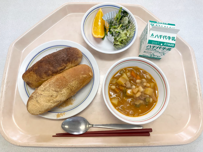 【B献立】二色揚パン(きなこ&ココア) じゃこサラダ ポークビーンズ オレンジ