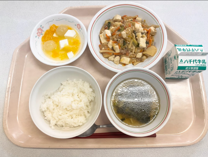 【A献立】船橋産「コシヒカリ」のご飯 四川豆腐 ねぎとわかめのスープ フルーツ杏仁