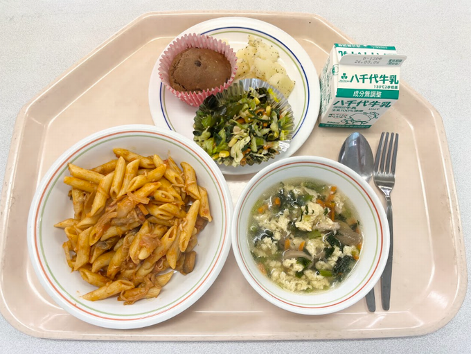 【B献立】きのことトマトソースのペンネ コーンサラダ スパイシーポテト イタリアンスープ チョコカップケーキ