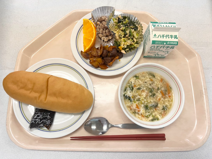 【B献立】コッペパン チョコクリーム レバーオリエンタル ツナとわかめのサラダ ココアビーンズ 卵スープ デコポン