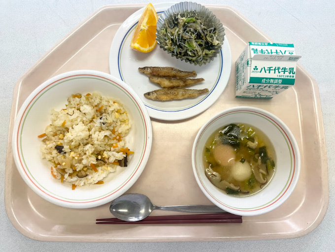 【A献立】ちらし寿司 わかさぎの唐揚げ 船橋産小松菜の磯香和え 紅白スープ オレンジ