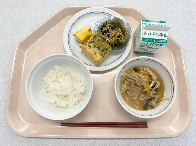 【A献立】ご飯 ツナとねぎの卵焼き ゆかり和え みそちゃんこ バナナ
