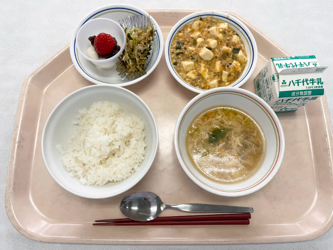 【A献立】ご飯 麻婆豆腐 きゅうりともやしの中華風ナムル 卵の鶏ガラスープ いちごあずき白玉