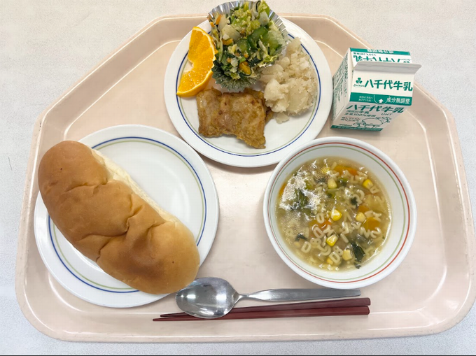 【B献立】ハチミツパン ししゃものレモンソースかけ 生揚げのサラダ ひよこ豆のミルクスープ オレンジ