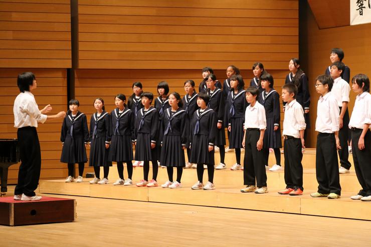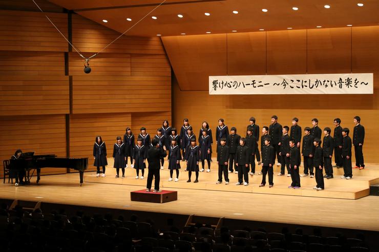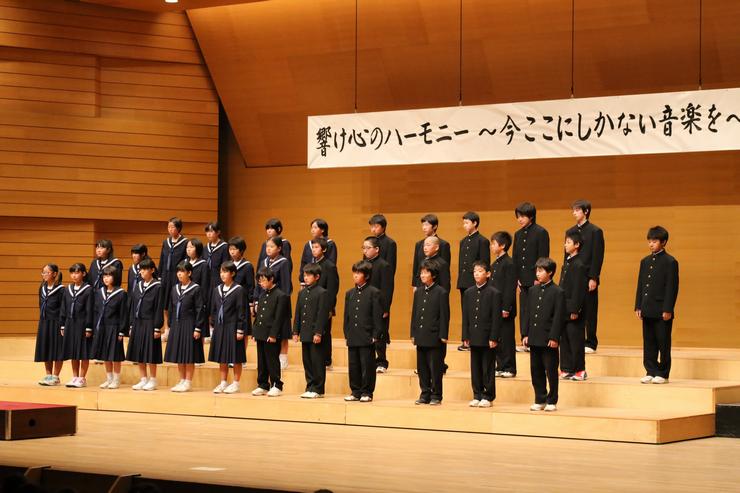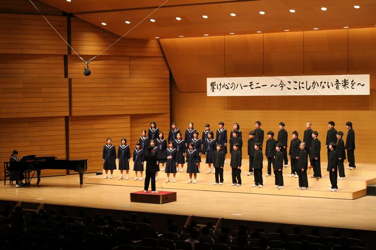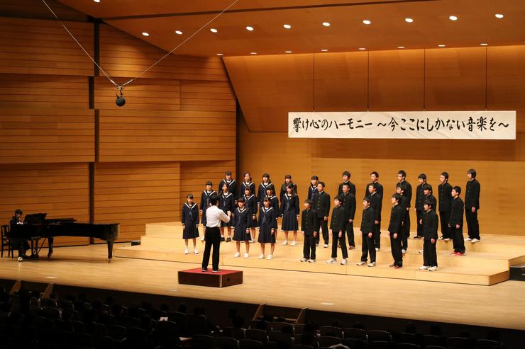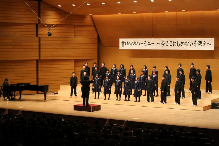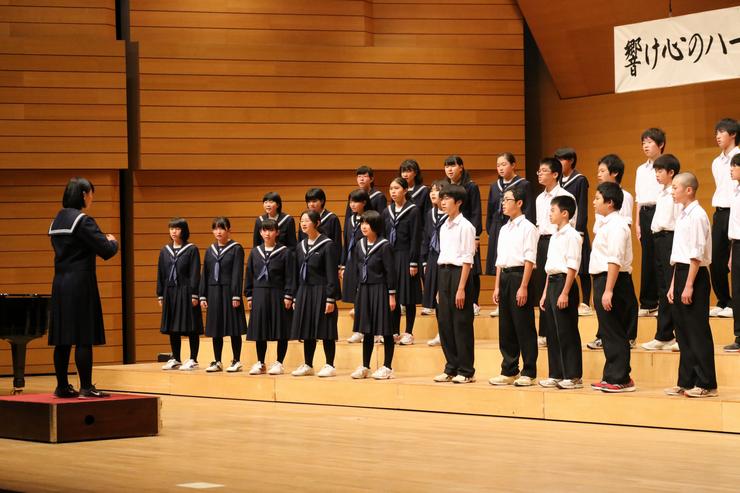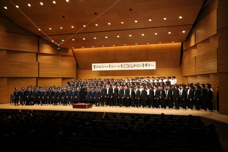 【2年】迫力ある歌声と美しいハーモニーでひと回り成長した姿を見せてくれました。(写真左上は「最優秀賞」2年5組、同右上は「優秀賞」2年7組、同左下は「優良賞」2年4組)