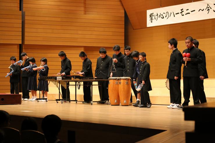 【1組】息の合った楽器演奏を披露し会場を和ませてくれました。みな緊張していたのか、終わった後の満面の笑みが印象的でした。(写真下)