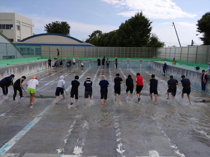 今年度も保健体育の授業で水泳授業を予定しています。その準備の為、 6月13日(火曜日)の午後に職員によるプール掃除を行いました。その日は前期中間テスト1日目で採点や印刷等ある中でしたが、生徒たちが気持ちよく水泳の授業が行えるようにと多くの職員がプール掃除に参加しました。