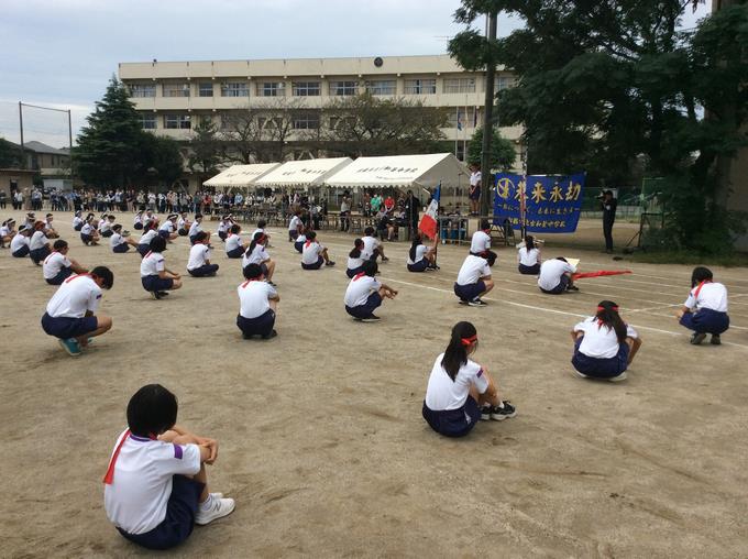 インフルエンザの感染拡大防止のため延期していた体育祭を10月5日(木曜日)に開催しました。 今年度のスローガン「正々堂々 ~この仲間で今しかできないことを全力で~」の下、体育祭実行委員、応援団、団旗係を中心に準備を進め、各競技や応援を通して、各色が一致団結し、精一杯取り組んでいました。総合優勝は赤組。応援賞も赤組でした。閉会式での各色の応援団長、実行委員長の挨拶では、級友や後輩、観覧に来てくださった保護者の方への感謝の気持ちや一生懸命に取り組んだ思いを話していました。1・2年生の皆さんには、3年生の思いを来年度の体育祭につなげてほしいです。観覧にお越しいただきました保護者の皆様。平日、ご多用の中、子供たちへの心温まる拍手をありがとうございました。PTAより記念品としてノートをいただきました。また、保護者・学校評議員受付をPTA本部役員の方々にお手伝いいただきました。ありがとうございました。