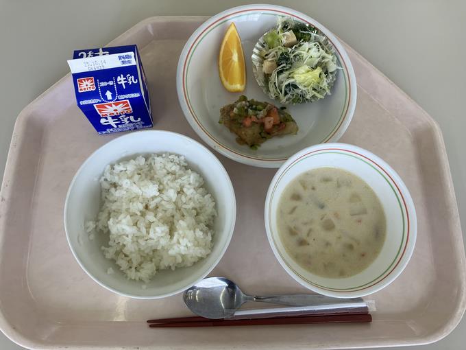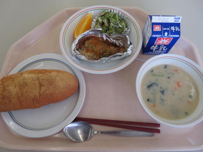 B献立 きなこ揚げパン、白身魚のオーロラソース、グリーンサラダ、あさりのチャウダー、オレンジ