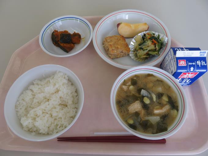 A献立 ご飯、松風焼き、かぼちゃの甘煮、千草和え、打ち豆みそ汁、りんご