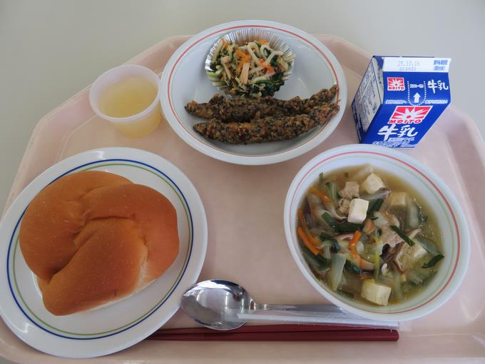B献立 ハチミツパン、ししゃものごま衣揚げ、大根サラダ、豆腐と白菜のスープ、なしゼリー