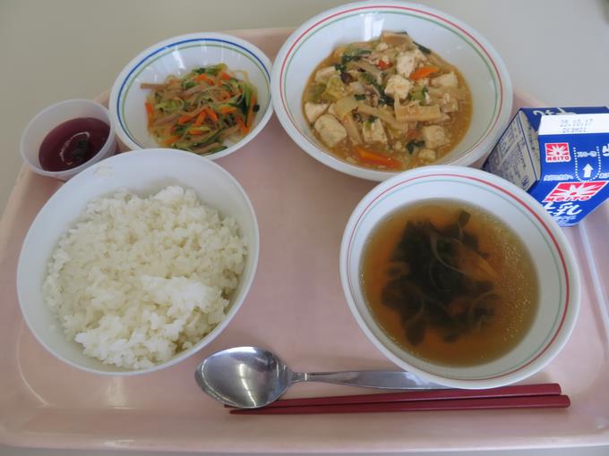 A献立 ご飯、麻婆豆腐、切り干し大根のナムル、春雨スープ、いよかん