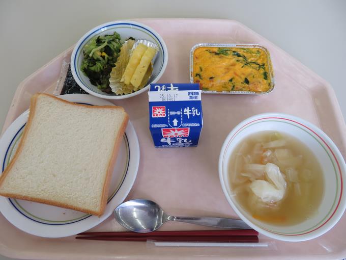 B献立 食パン、ブルーベリージャム、ほうれん草のキッシュ、コーンとわかめのサラダ、キャベツとチキンのスープ、パインアップル