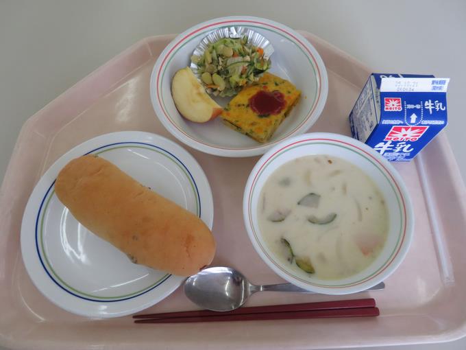 B献立 ブドウパン、パンプキンオムレツ、ささみサラダ、白いんげん豆のクリームスープ、りんご