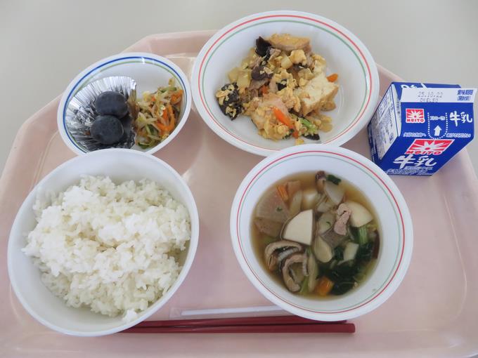 A献立 ご飯、れんこん入りつくね、高野豆腐の煮物、きゅうりとだいこんの塩もみ、めかぶのみそ汁、ぶどう