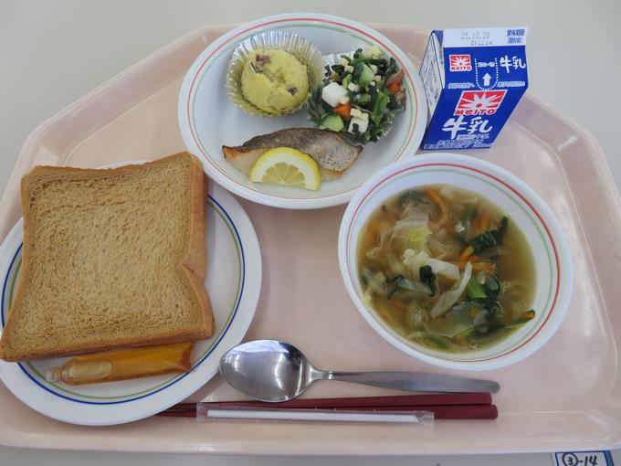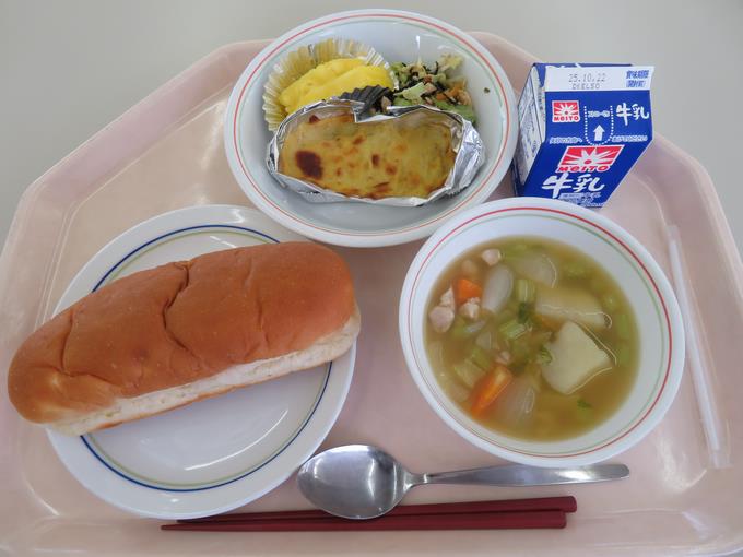 B献立 さつまいもパン、魚の黄金焼き、ツナのりサラダ、ポトフ、パインアップル