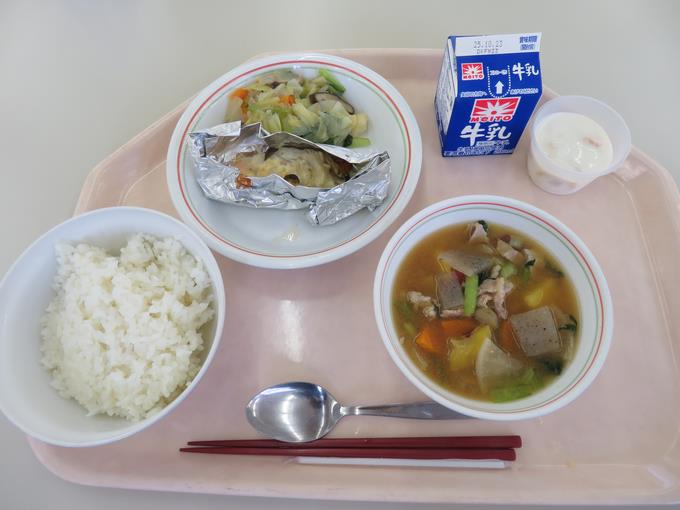 A献立 ご飯、鮭ときのこのチーズ焼き、野菜いため、さつま汁、ヨーグルト和え