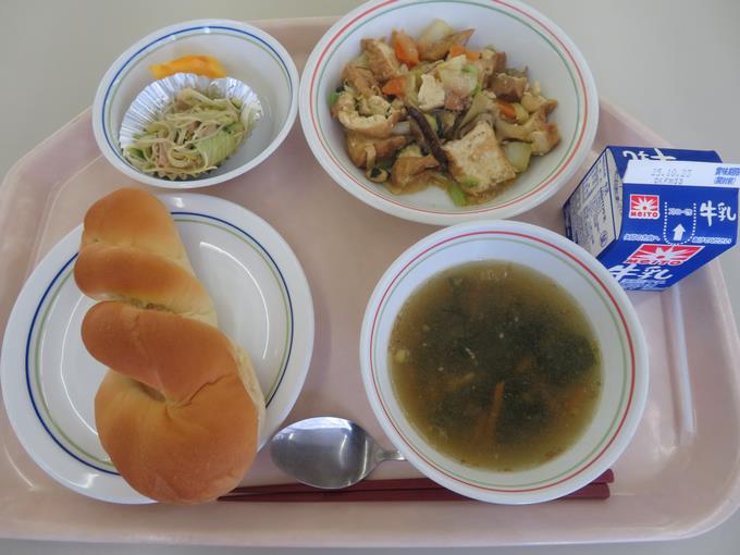 B献立 ミルクロール、家常豆腐(ジャーチャントウフ)ビーフンとハムのサラダ、中華風コーンスープ、かき