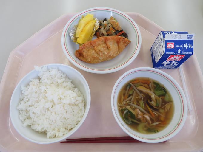 A献立 ご飯、手作り揚げぎょうざ、春雨のカラフルソテー、千切りスープ、パインアップル