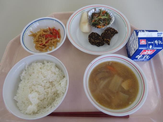 A献立 ご飯、牛乳、魚の七味焼き、おろし添え、里芋のそぼろ煮、うずら卵のお吸い物、あずき白玉