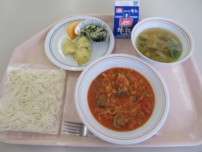 B献立 ソフト麺なすとツナのトマトソース、じゃがバター、海藻サラダ、野菜スープ、かき
