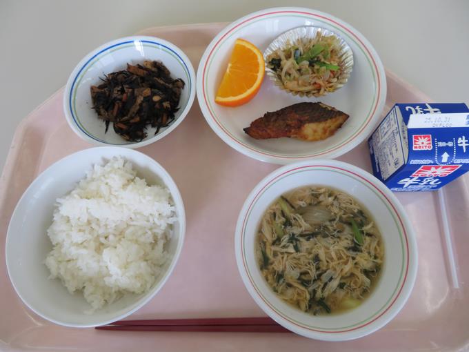 A献立 ご飯、魚の西京焼き、おかか和え、ひじきの五目煮、むらくも汁、オレンジ ※魚は船橋産の黒鯛です