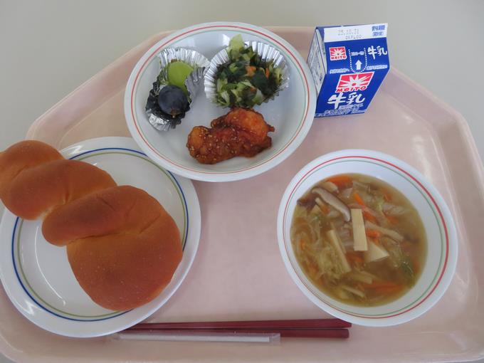 B献立 ブドウパン、チキン南蛮、しらたきのチャプチェ風、もずくと卵のスープ、オレンジ(※いちごが変更になりました)