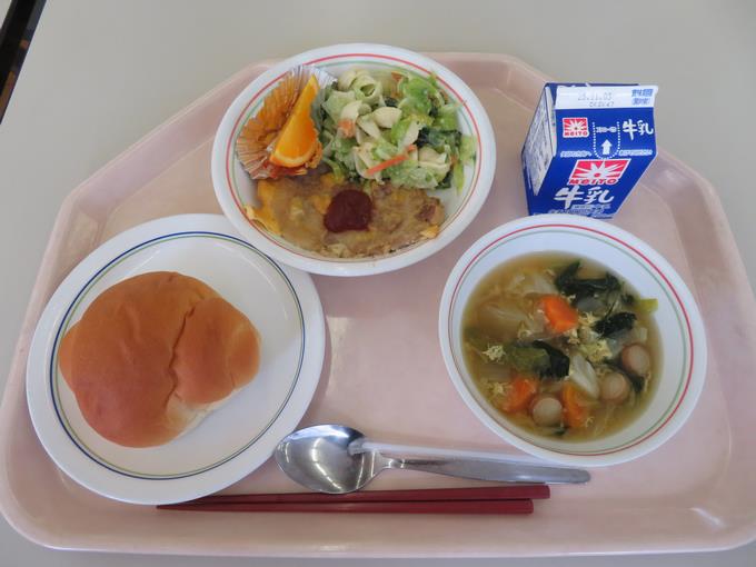 B献立 カルシウムパン、ポークピカタ、マカロニサラダ、野菜とウインナーのスープ煮、オレンジ