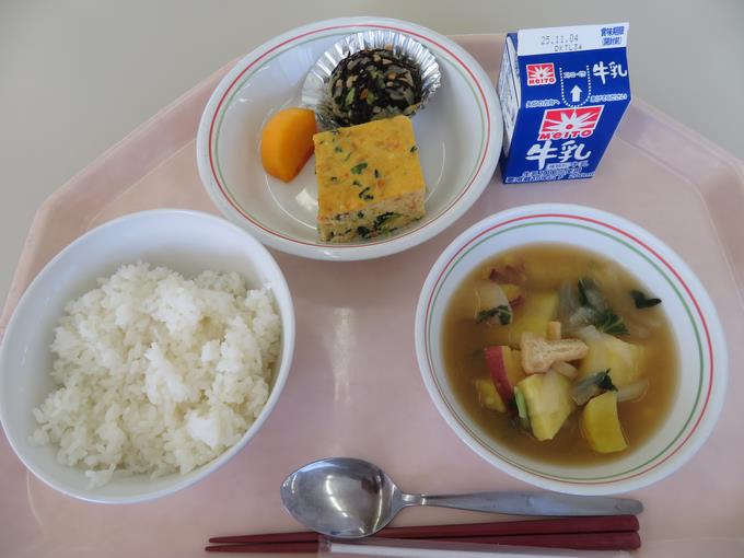 A献立 ご飯、千草焼き、ひじき入り納豆和え、さつま芋と油揚げのみそ汁、柿