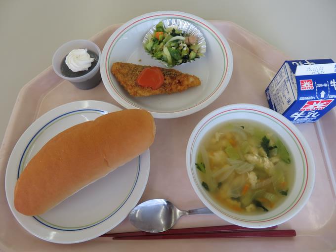 B献立 コッペパン、魚のフライ、ひよこ豆のサラダ、イタリアンスープ、黒ごま豆乳ゼリー