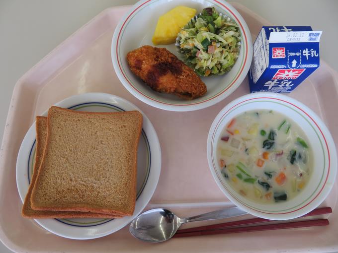 B献立 黒糖食パン、白身魚のフライ、レンズ豆のドレッシングサラダ、コーンチャウダー、パインアップル