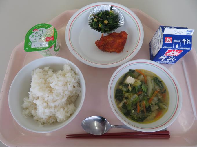 A献立 ご飯、揚げ鶏のカレーソースかけ、ほうれん草のサラダ、白菜スープ、ヨーグルト