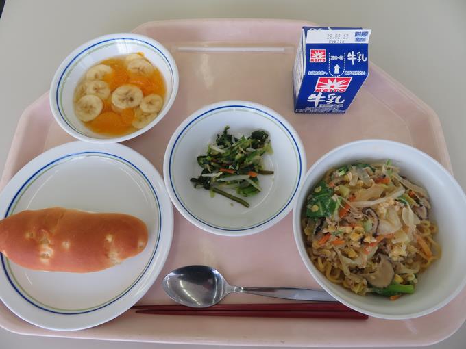 B献立 えび入り上海焼きそば、甘納豆パン、もやしとハムの中華和え、しらす干し入り卵スープ、いちご