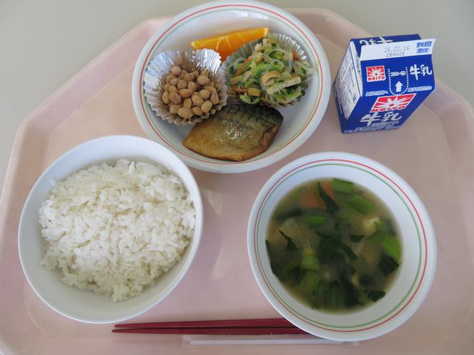 A献立 ご飯、さばのオレンジ煮、フライビーンズ、千草あえ、小松菜と豆腐のみそ汁、オレンジ