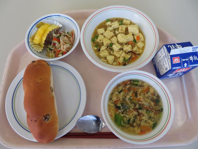 B献立 ブドウパン、豆腐のカレー煮、バンバンジー、もずくと卵のスープ、パインアップル