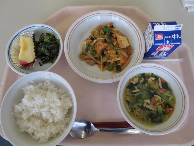 A献立 ご飯、豚キムチ炒め、韓国風サラダ、春雨スープ、りんご