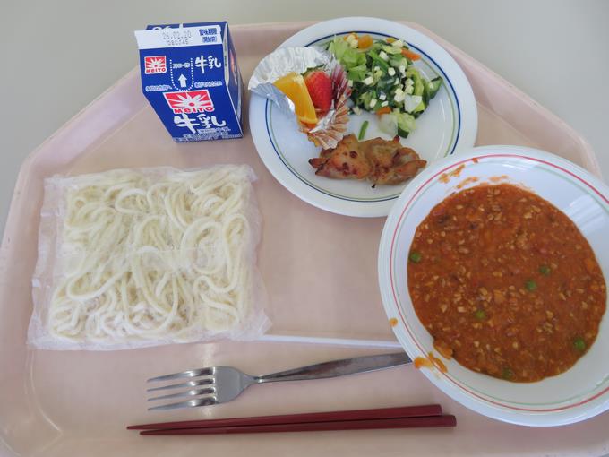 B献立 ソフト麺ミートソース、鶏肉の塩こうじ焼き、マセドニアサラダ、二色フルーツ(いちご・オレンジ)