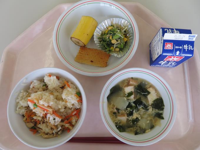 A献立 鶏ごぼうおこわ、生揚げの野菜ソースかけ、わさび和え、なめこのみそ汁、あずき白玉