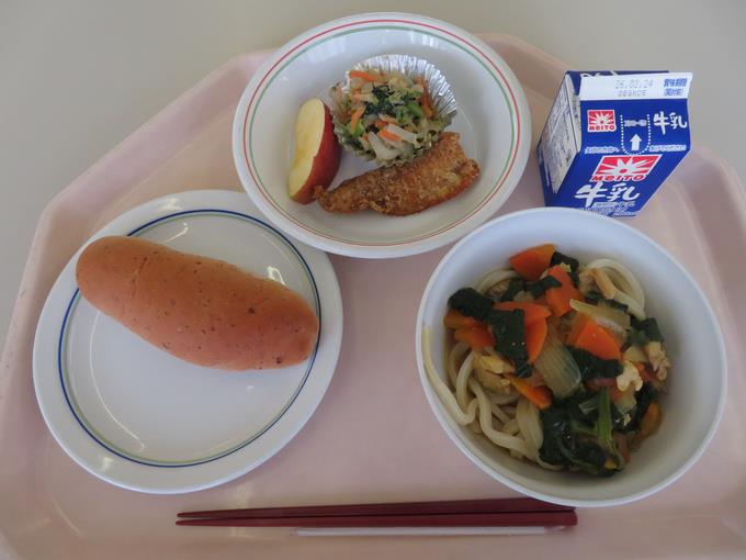 B献立 カレーうどん、このしろの香味あげ、ごぼうと青菜のごまサラダ、甘納豆パン、りんご
